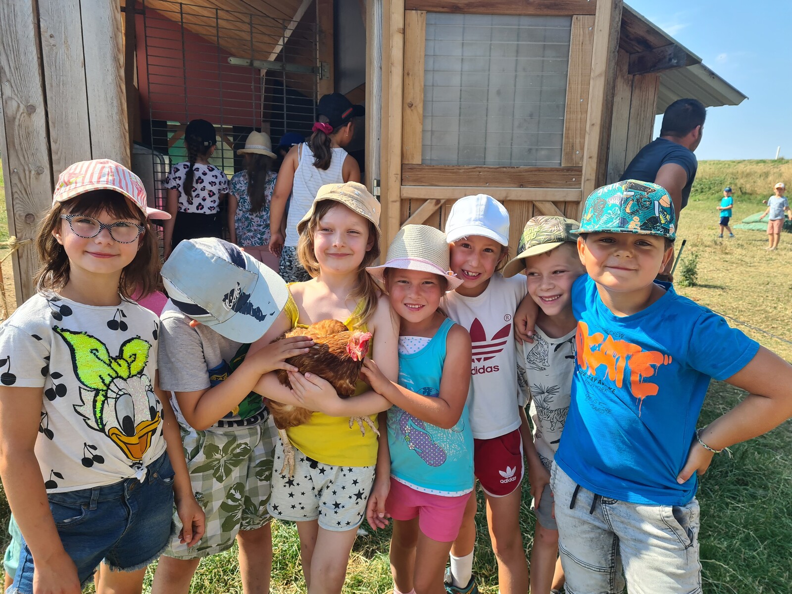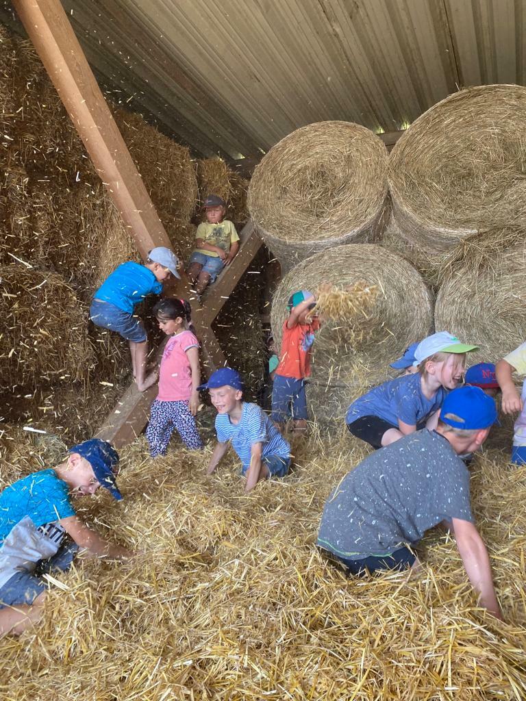 Auf dem Hof angekommen warteten schon die Hühner und Enten auf uns. Manche der Hühner ließen sich sogar geduldig streicheln, während andere lieber in einer stillen Ecke ihren Nachwuchs ausbrüteten. Im großen Kaninchenauslauf wurden so einige Freundschaften zwischen den Tieren und Kindern geschlossen. Weiter ging es dann in den großen und offenen Kuhstall. Ausgerüstet mit duftendem Heu durften wir die Kühe füttern und diese faszinierenden Tiere aus nächster Distanz beobachten. Nachdem die Rinder ihre Mahlzeit erhalten hatten, waren wir an der Reihe. In einem liebevoll hergerichteten Strohballen-Café wurden wir von Familie Scheuermann mit erfrischender Melone, köstlichen Muffins und kühlen Getränken versorgt. An der Schule angekommen waren wir zwar müde aber auch überaus glücklich und um eine wertvolle und einmalige Erfahrung reicher.