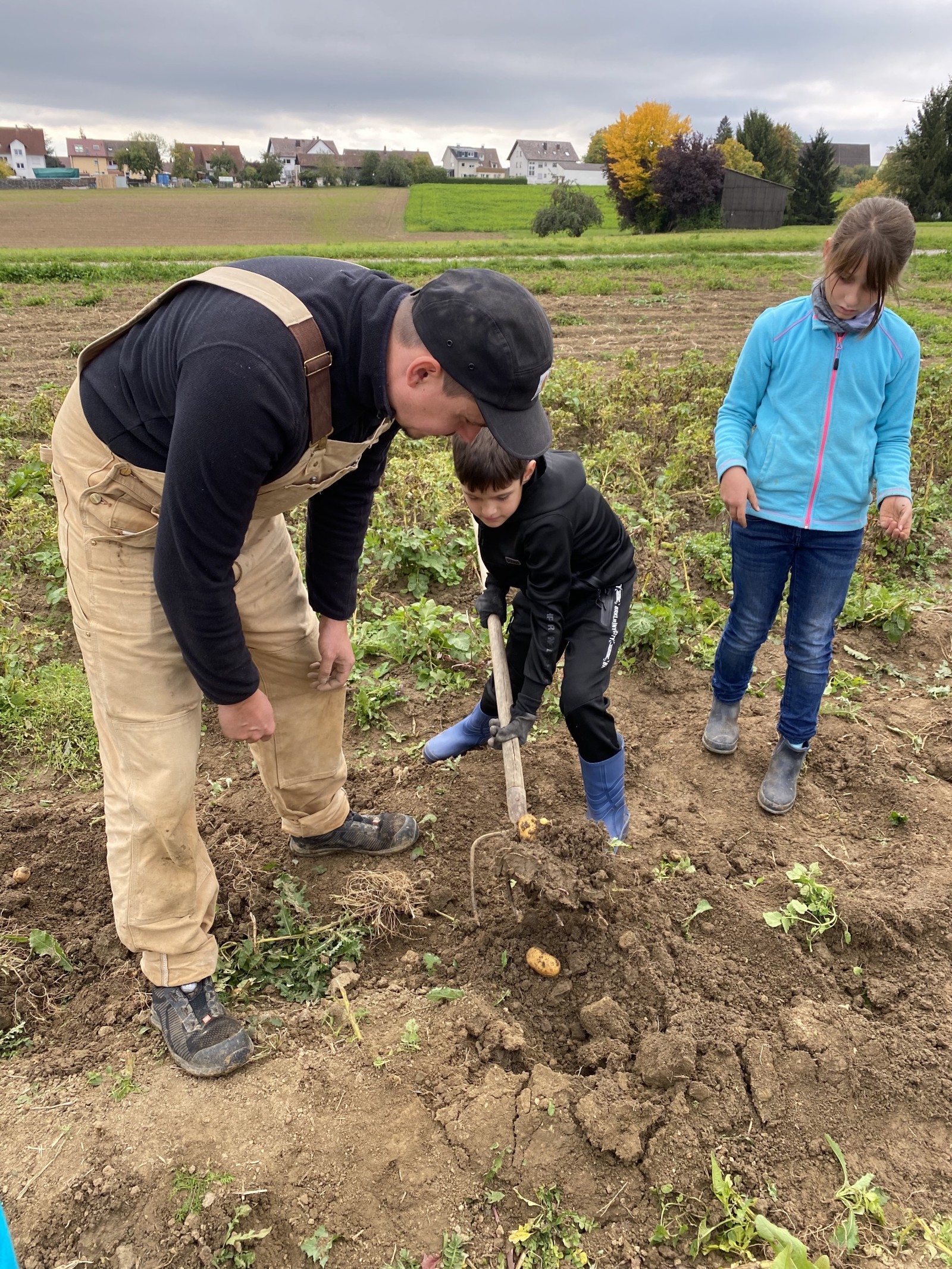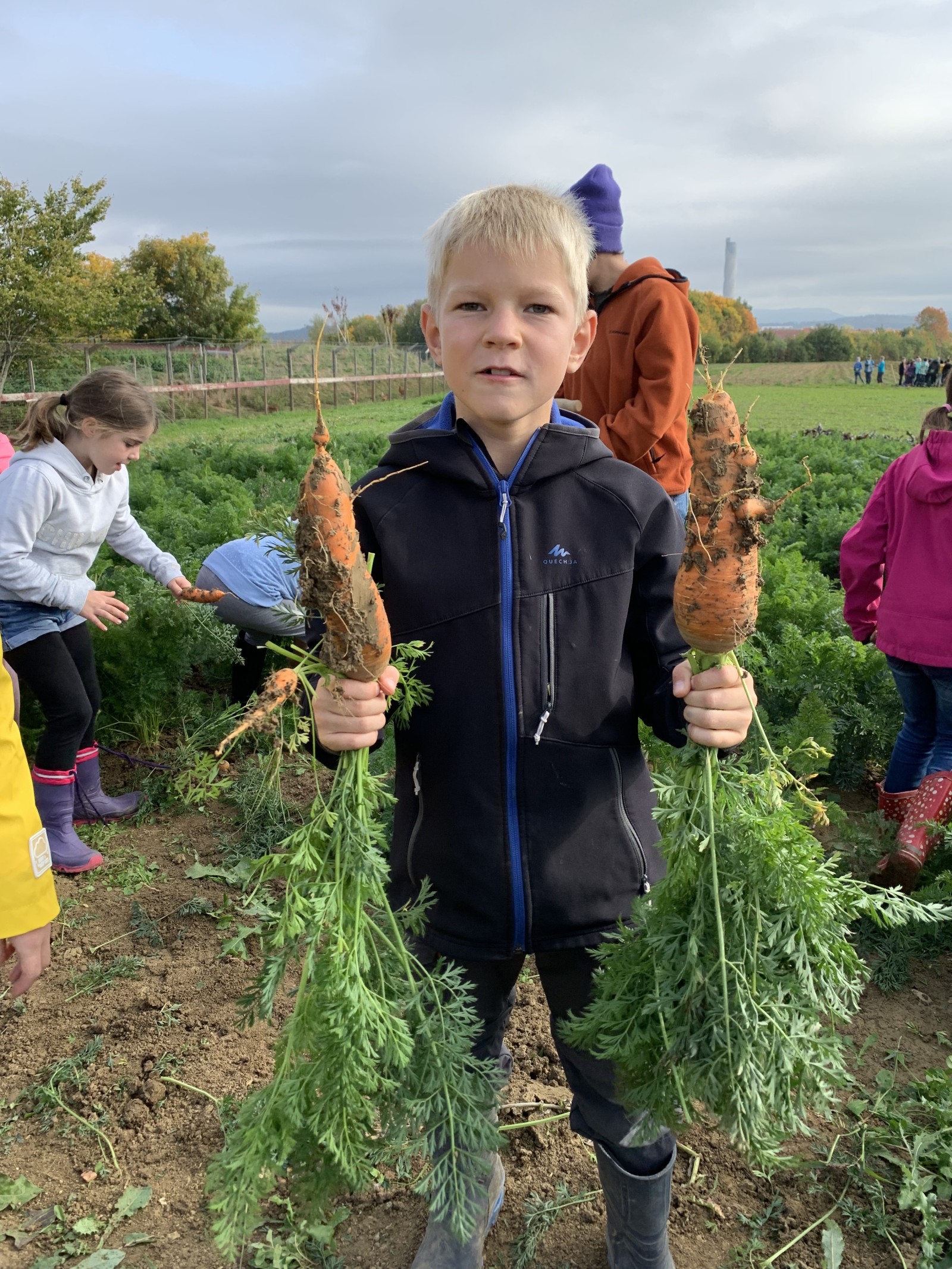 Die Klassenstufe 3 machte sich im Rahmen des aktuellen Sachunterrichtsthemas „Die Kartoffel“ auf den Weg zum Glasers Hof nach Zimmern ob Rottweil. Auf dem Hof angekommen wurden wir liebevoll von der Familie Michel sowie ihren Hühnern und Ziegen empfangen. Zunächst lernten die Schülerinnen und Schüler die angebauten Produkte kennen und konnten auch schon ihr bereits erworbenes Wissen zur Kartoffel an einer realen Kartoffelpflanze anwenden und zeigen. Nachdem ein Kartoffelroder und eine Sortiermaschine genauer unter die Lupe genommen wurden, durften die Kinder hautnah bei der Ernte dabei sein. Mit Gummistiefeln und Spaten ausgerüstet, ging es für die Schülerinnen und Schüler auf das Kartoffelfeld. Mit etwas Hilfe von Familie Michel konnten hier viele Kartoffeln geerntet werden. Auch bei der Karottenernte durften die Schülerinnen und Schüler hautnah dabei sein und mit viel Freude teilweise riesige Karotten aus der Erde ziehen. Mit Karotten im Rucksack und zwei Säcken Kartoffeln in der Hand machten sich die Kinder schließlich nach einem spannenden und erlebnisreichen Vormittag auf den Rückweg zur Schule.