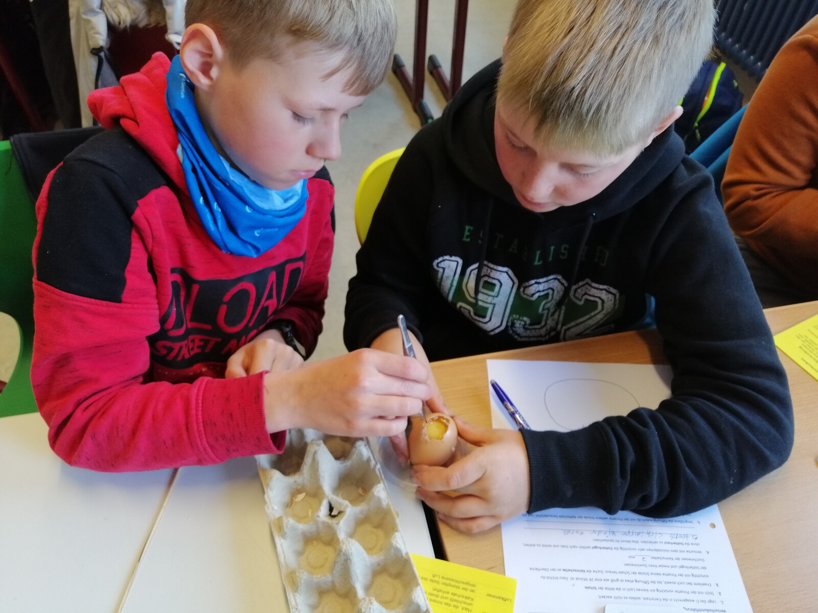 Erstaunt stellten die Kinder fest, dass selbst die kleinsten Bestandteile zu sehen sind. Anschließend wurden der Inhalt der Eier gezeichnet und mit Fachbegriffen beschriftet. Und über eine große Portion rohe Eier durfte sich der eine oder andere Hund zuhause freuen.