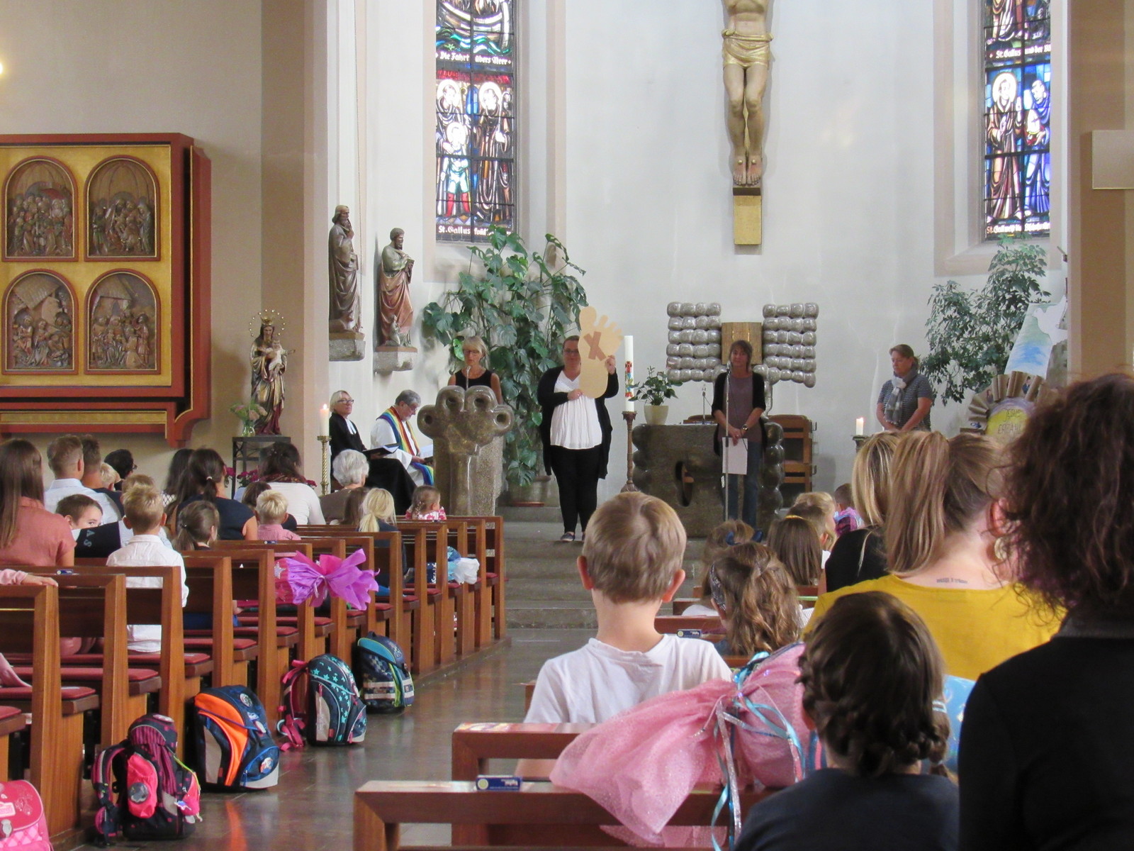 „Alles ein wenig anders“ betonte Grundschulkoordinatorin Birgit Storz, „aber trotz Corona feierlich“. Die diesjährige Einschulungsfeier fand ausschließlich in der Kirche St. Gallus statt. Getrennt nach beiden Parallelklassen und unter Einhaltung der Hygienemaßnahmen gleich zweimal. Pfarrerin Esther Kuhn-Luz und Pfarrer Hermann Barth feierten die vom Team des Kindergartens St. Maria mitgestalteten Gottesdienste. Dieses zeigte anhand übergroßer Fußspuren den Weg in den neuen Lebensabschnitt auf und entließ den großen Jahrgang in die Schule.
