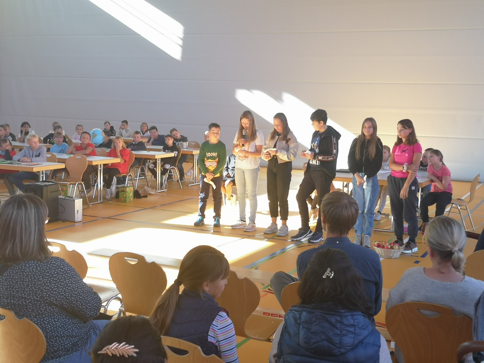 Zum Abschluss der Begrüßungsfeier stellte die Apfelklasse, die diesjährigen Sechstklässler, das Unterrichtsprojekt „Das grüne Klassenzimmer“ vor und überreichten jeder Schülerin und jedem Schüler einen Apfel.
