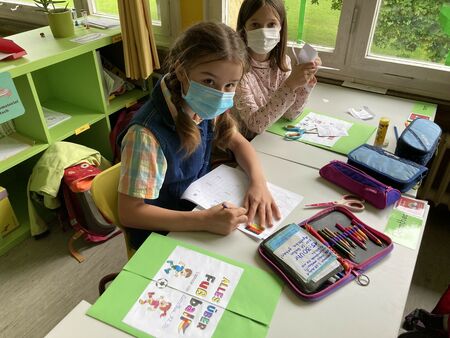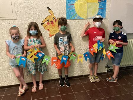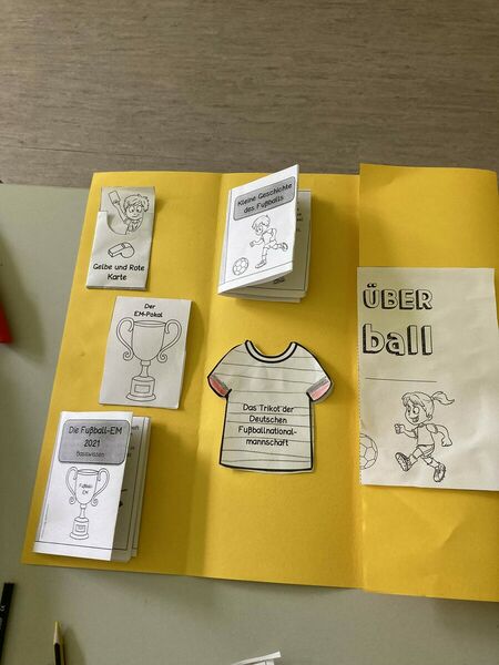 Anlässlich der Fußballeuropameisterschaft und des durchwachsenen Wetters Anfang letzter Woche, haben sich die Klassen 1b und 3b in einem Teil des Sportunterrichts mit der Fußball-EM beschäftigt. Die Klasse 1b hat eine Wimpelkette mit den Flaggen von allen 24 Teilnehmerländern gestaltet, die nun das Klassenzimmer schmückt. Die Klasse 3b hat sich ausführlicher mit dem Thema Fußball auseinandergesetzt und alle Schülerinnen und Schüler haben ihr individuelles Fußball-Lapbook gestaltet. Außerdem fiebern die Schülerinnen und Schüler der Klasse 3b und 4b während der Fußball-EM durch ihr eigenes kleines Klassen-Fußballwettbüro mit den Mannschaften mit.
