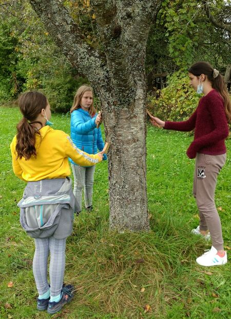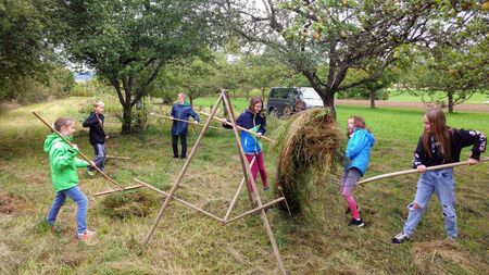 An drei verschiedenen Stationen wurde Heu gerecht und auf sogenannte „Heinzen“ geschichtet, Bäume mit frischem Humus versorgt und mit Hilfe von Drahtbürsten die Rinde von unliebsamen Moosen und Flechten befreit. Am Ende waren sich alle Schülerinnen und Schüler einig: „Das hat so viel Spaß gemacht, wir kommen sehr gerne wieder!“
