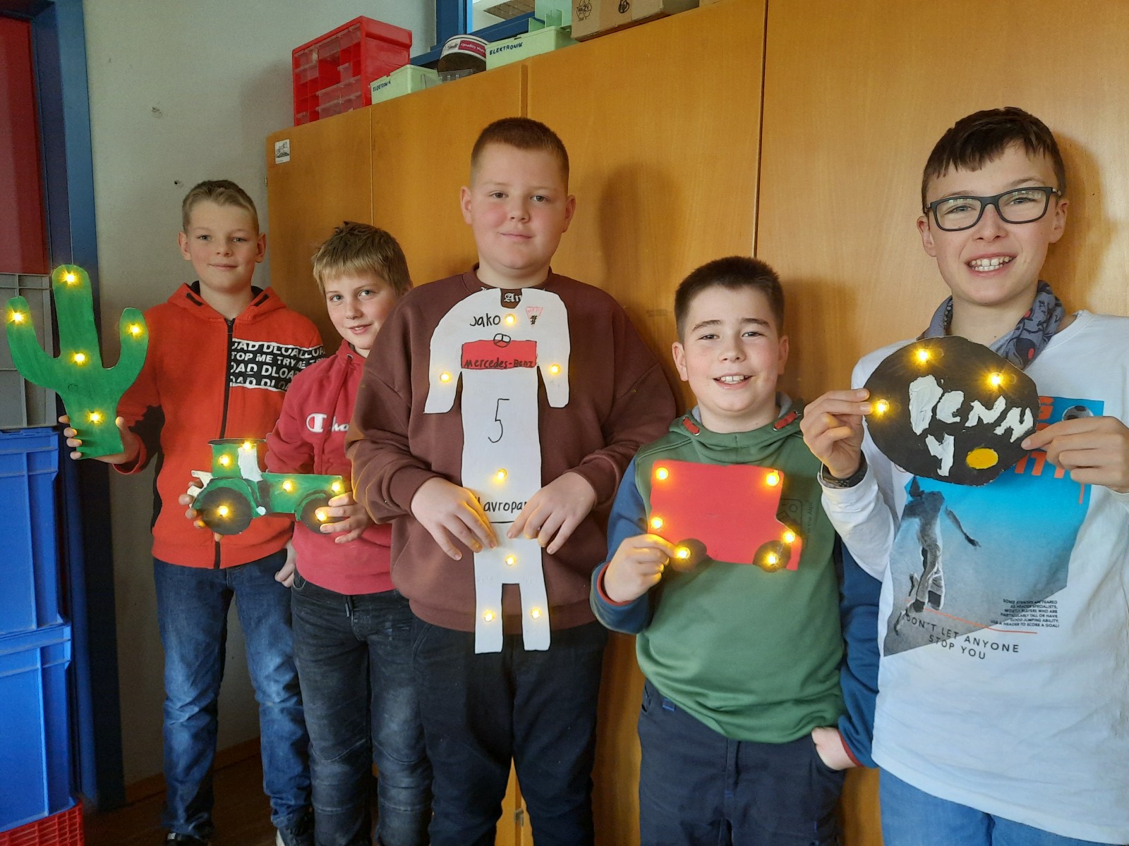 Nachdem die Schüler:innen der Klassen 6 sich im Technikunterricht für ein Motiv entschieden hatten, wurde dieses auf Holzplatten aufgezeichnet, ausgesägt und fein geschliffen. Danach wurden die Werke angemalt und mit Löchern versehen, in die Lämpchen für die Beleuchtung eingeklebt wurden.