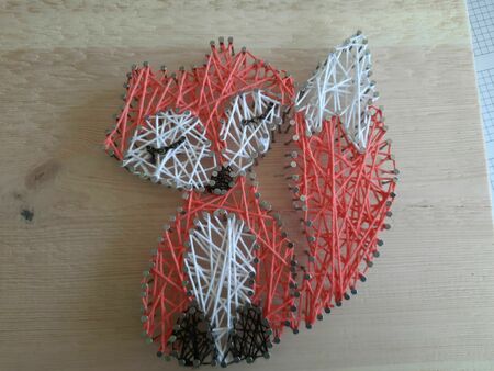 Das Brett schleifen, alle Nägel präzise einschlagen, die Bildvorlage vollständig entfernen sowie die Wolle suaber spannen.