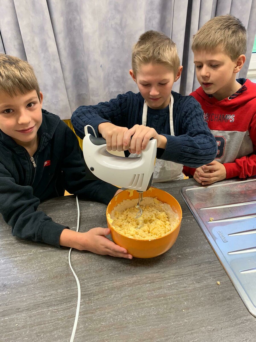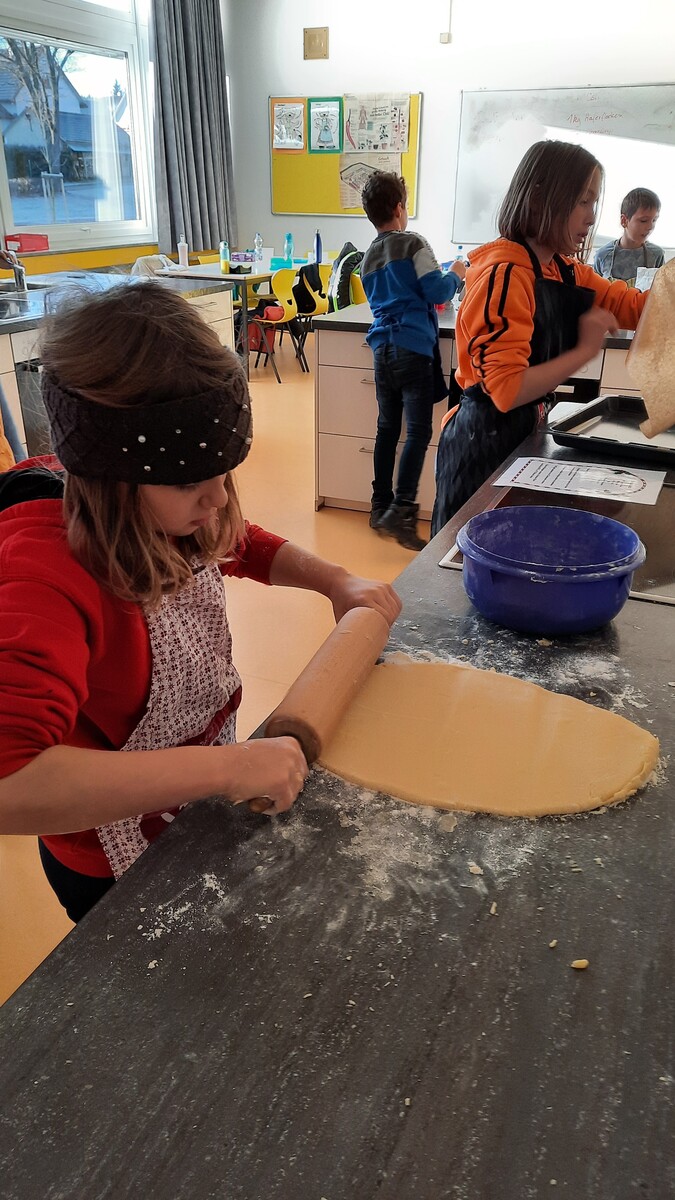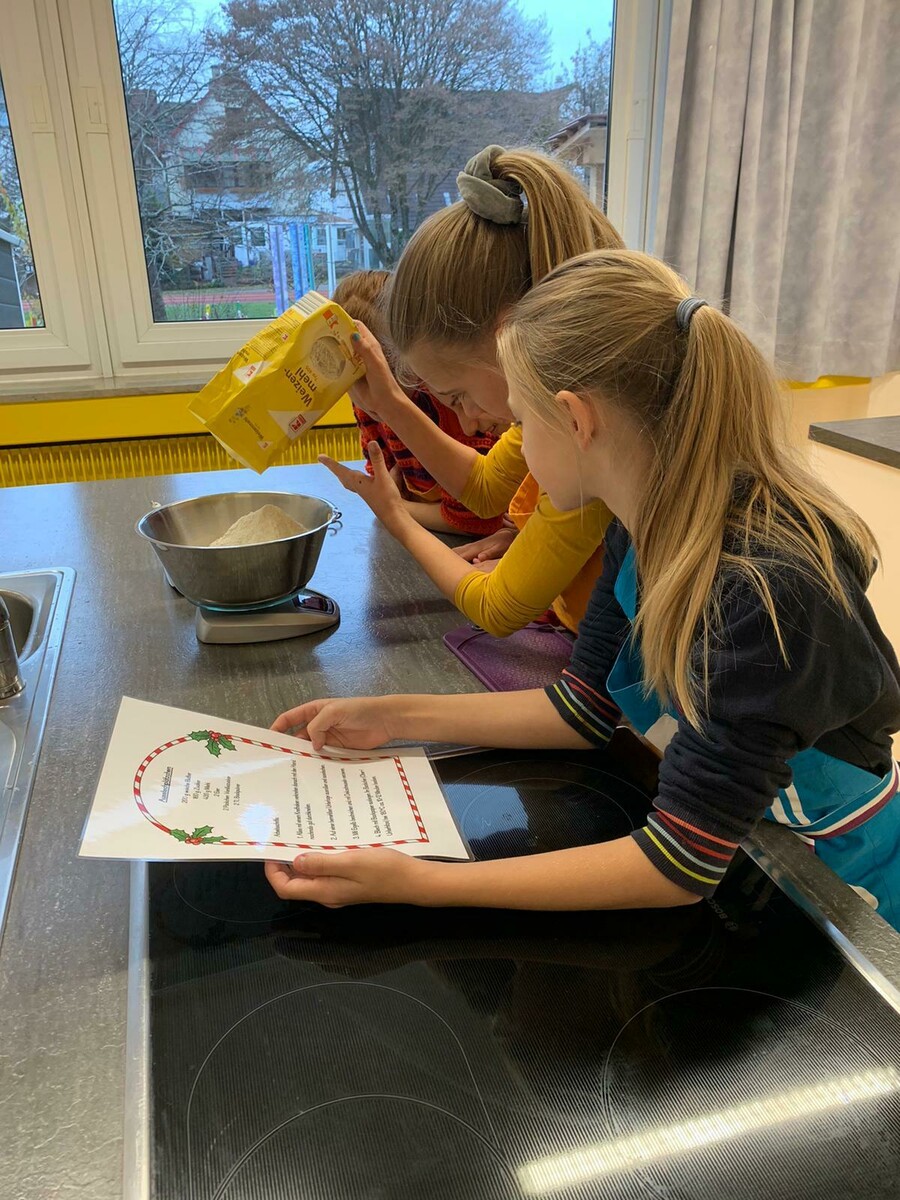 Voller Enthusiasmus machten sich die Schülerinnen und Schüler der Klassen 4a und 4b an die Arbeit: In der Schulküche wurden Zutaten gewogen, Teig geknetet, Plätzchen ausgestochen und gebacken.