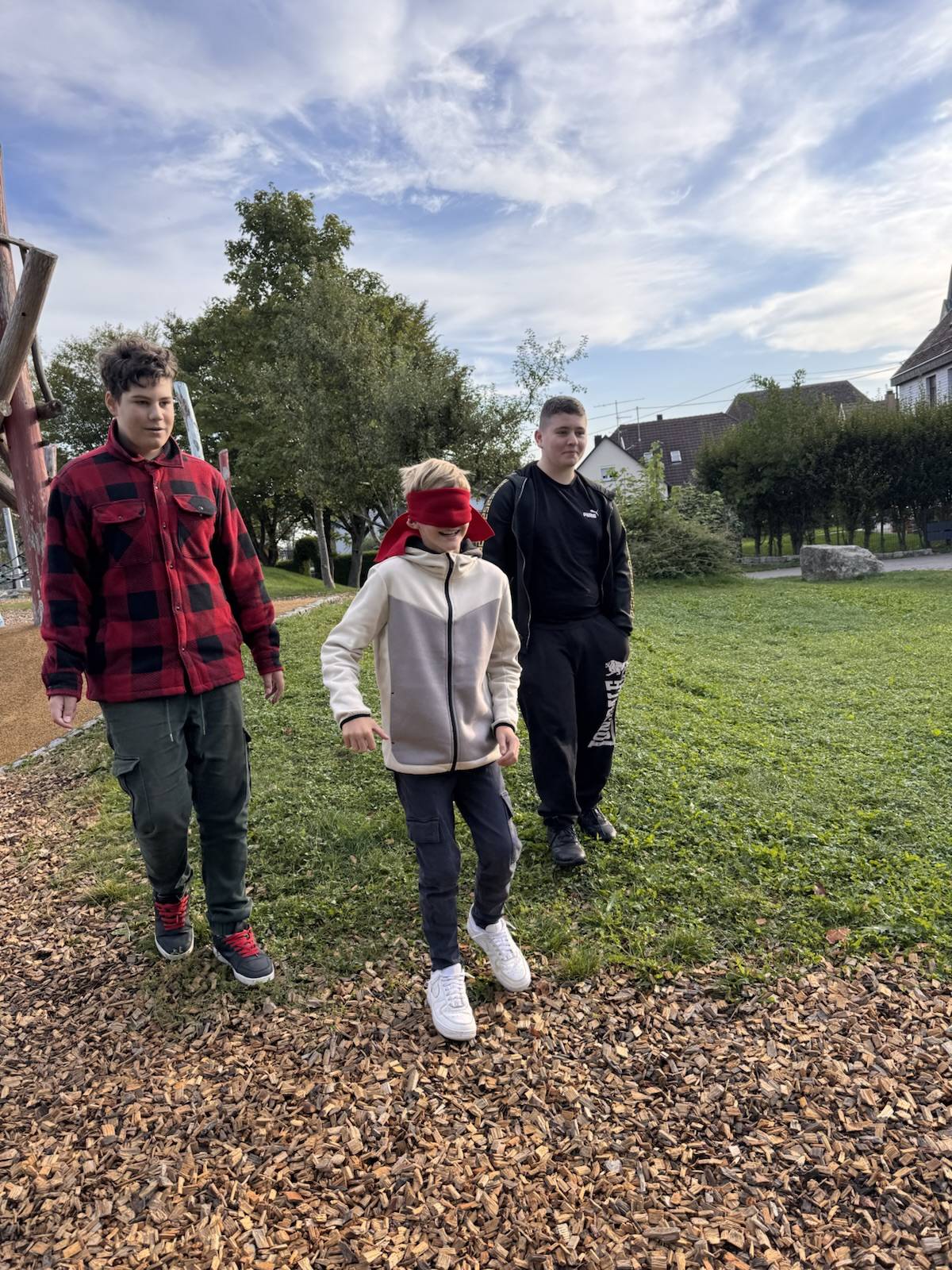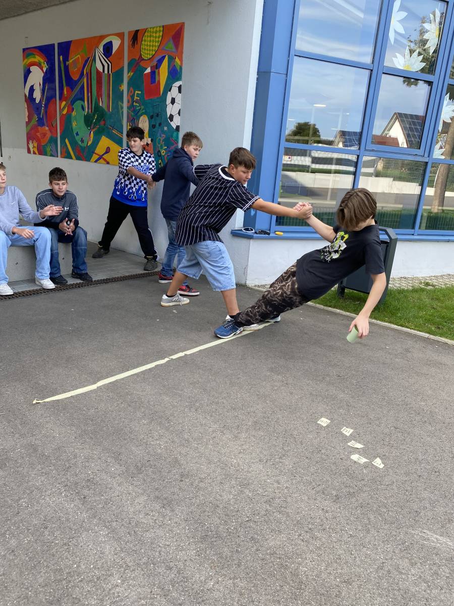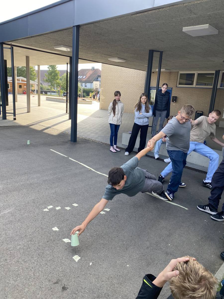 Am 19.09.2024 haben die Klassen 8a und 8b zusammen mit ihren Klassenlehrerinnen und Frau Seifried eine Einheit zum Teambuilding durchgeführt. Neben Vertrauensübungen, wie dem gegenseitigen Führen über das Schulgelände mit verbundenen Augen, bewältigten sie in Kleingruppen verschiedene kooperative Challenges. In ihren Teams haben sie gemeinsam eine Decke gewendet und in 3er- bzw. 4er-Gruppen mussten sie einen Becher so weit wie möglich hinter einer markierten Linie abstellen, ohne dabei den Boden zu berühren. Im Fokus stand, dass die Jahrgangsstufe weiter zusammenwächst, sich gegenseitig unterstützt und zusammenarbeitet.