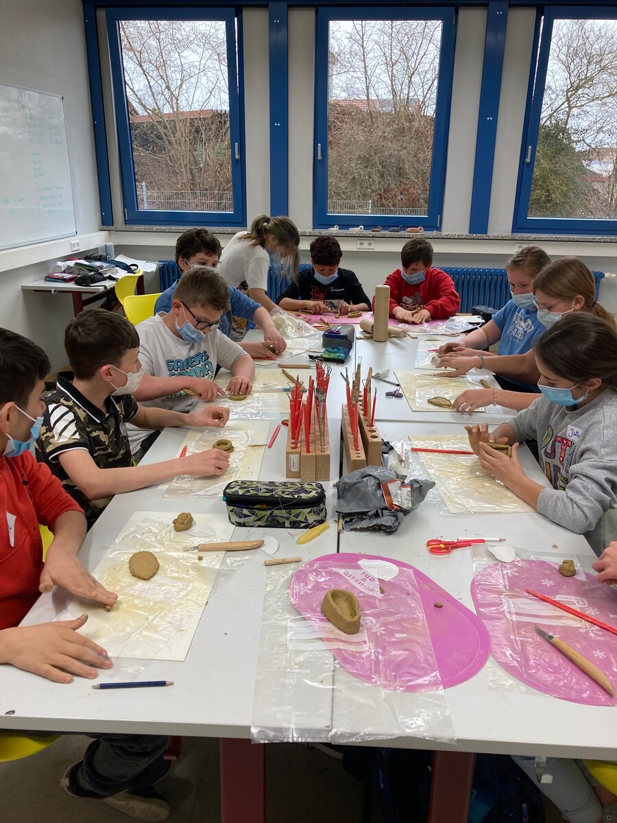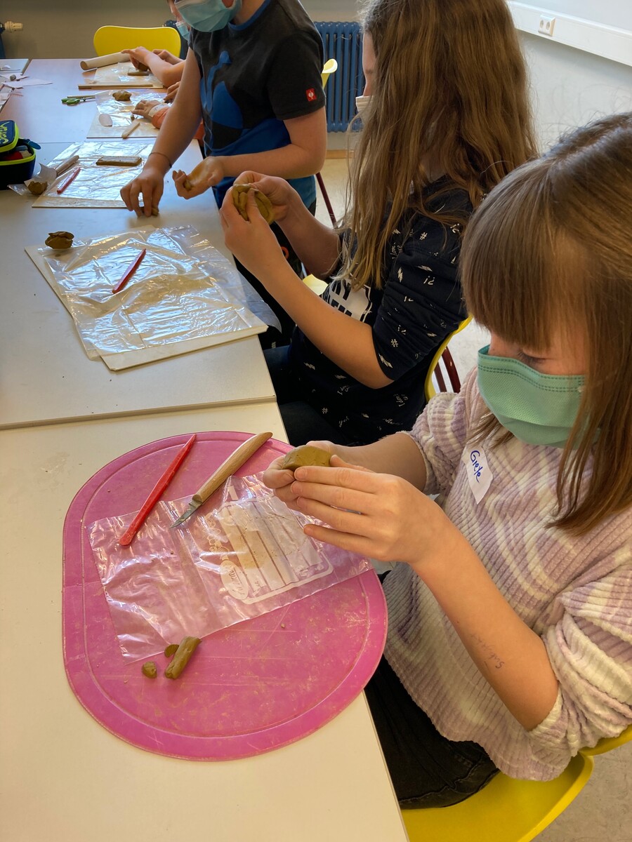 Die Kinder der Klasse 5a beschäftigten sich im Fach Geschichte mit der Steinzeit und der Antike. In diesem Zusammenhang setzten sie sich auch mit dem Kulturgut des Töpferns auseinander. Mit dem handlungsorientierten Konzept der Schule und dank der ehemaligen Lehrerin Sabine Gauß gab es einen kleinen Töpfer-Workshop. Die Fünftklässlerin Louisa Heim berichtet: