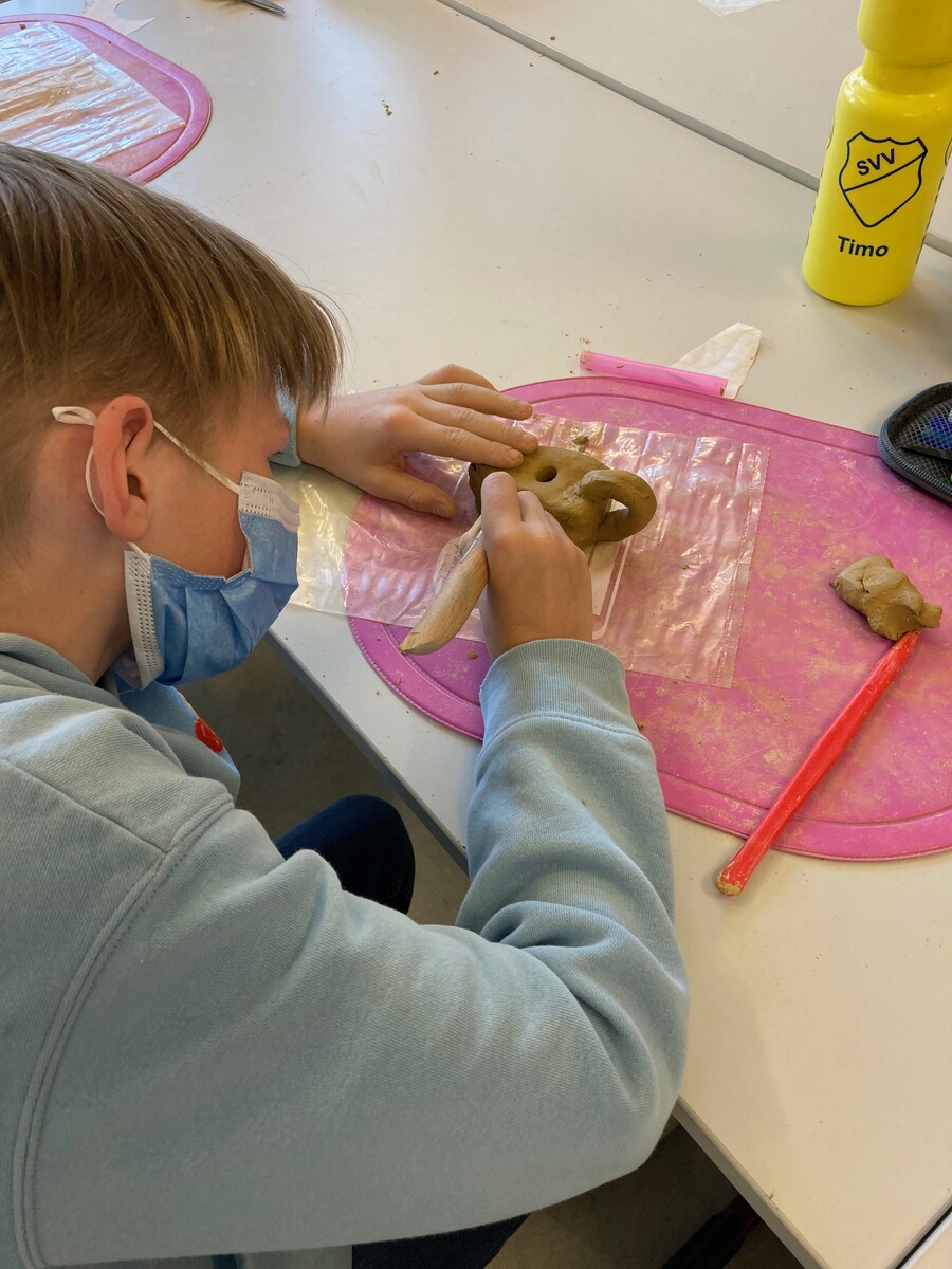 „Erst hat und Frau Gauß alles erklärt und wir haben alle aufmerksam zugehört. Dann haben wir alle ein Stück Ton bekommen und mussten dieses erst einmal schlagen, sodass die Luft rausgeht. Außerdem haben wir die Daumentechnik eingeübt. Als Frau Gauß sagte: „Wir machen eine Öllampe!“ haben wir nicht gewusst, was das ist und sie hat uns einige Modelle gezeigt. Nachdem alle Kinder noch einmal ein großes Stück Ton bekommen und geschlagen hatten, haben alle eine Form mit dem Tonmesser ausgeschnitten. Das untere Teil wurde aufgeraut und eine dicke lange Schnur geformt. Diese wurde auf den Boden gelegt und an der Seite leicht verschmiert, damit es schön haftet. Danach mussten alle nochmal eine dicke lange Schnur formen und diese auf die andere Seite legen und wieder leicht verschmieren. Dann mussten wir die zweite Schicht wieder aufrauen und den Deckel darauf legen. Davor mussten wir aber noch ein Loch rein machen. Zum Schluss ahben wir den Henkel hergestellt und angefügt.“