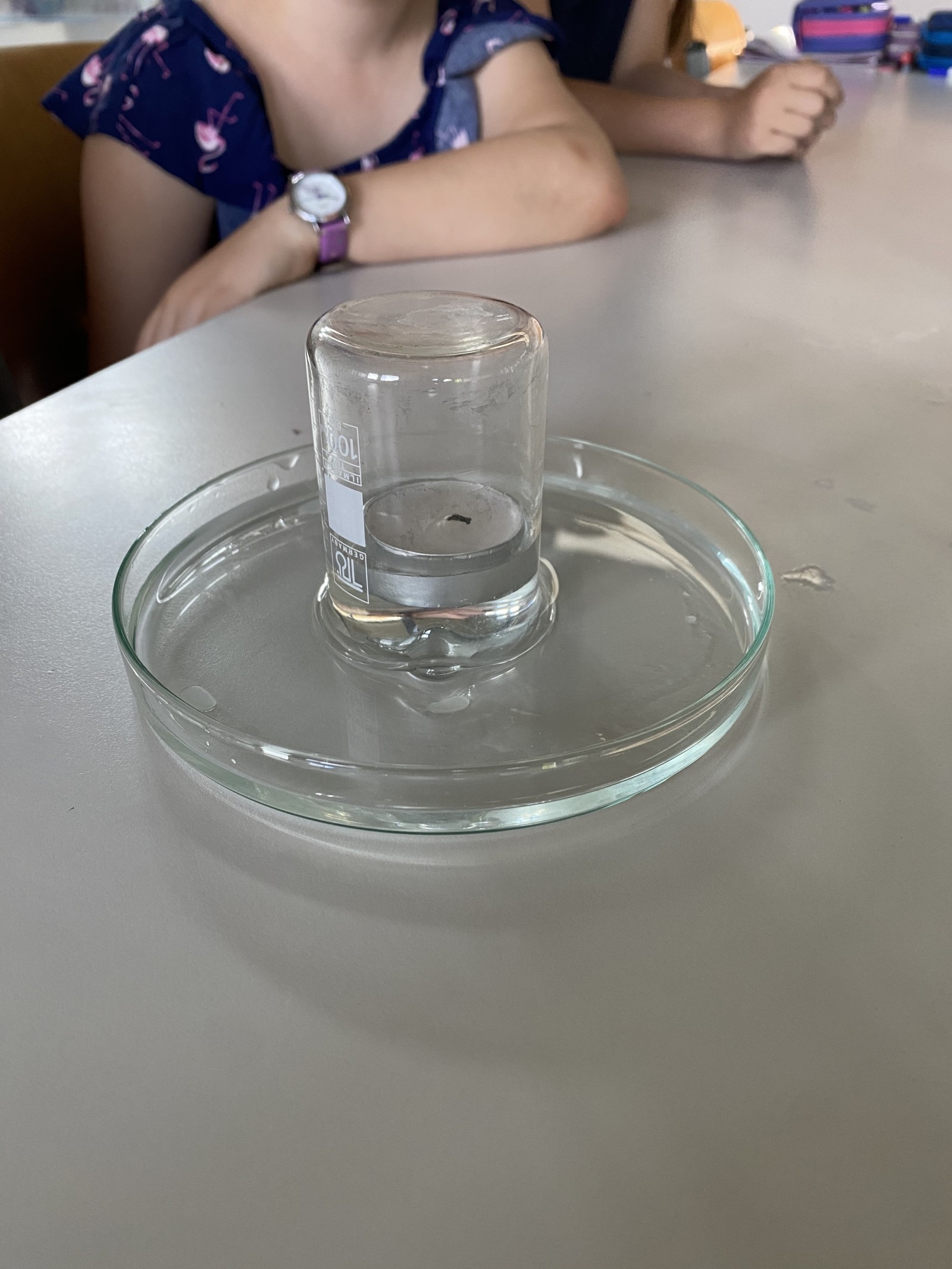 Wir haben eine Kerze angezündet und ein Glas darübergestülpt. Die Kerze ist nach ungefähr 17 Sekunden erlischt. Im nächsten Versuch haben wir einen kleinen Teller mit Wasser gefüllt und ein Teelicht angezündet. Danach haben wir ein Glas darüber gestellt. Zuerst ging die Kerze aus, weil sie nicht mehr atmen konnte. Dann ist das Wasser im Glas gestiegen und die Kerze schwamm nach oben. Die Sachunterrichtsstunde war sehr toll und wir hatten viel Spaß.
