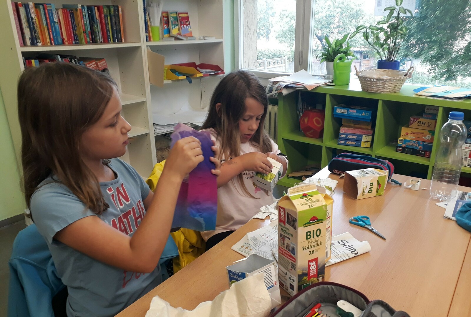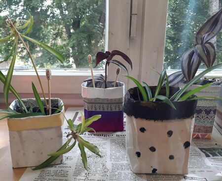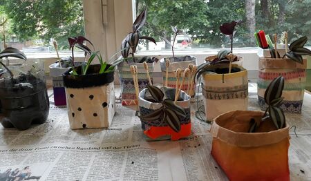 Die Schülerinnen und Schüler der Klasse 4a haben aus alten Milchtüten und Plastikflaschen kreative Blumentöpfe hergestellt.