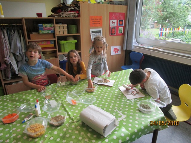 Das Programm gestaltete sich wieder einmal abwechslungsreich. Die Kinder erwartete täglich eine Mischung aus Basteln, Backen, Spiel und Spaß. So wurde schon morgens fleißig gemalt, außerdem wurden bunte Bilder aus Linsen, Erbsen und Nudeln hergestellt.