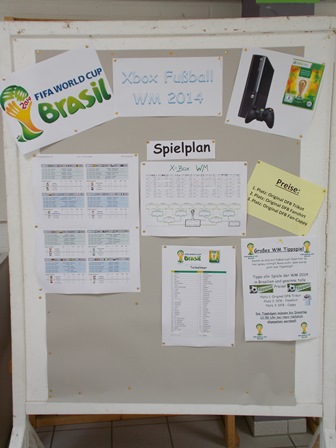 Mit großen Schritten fiebern wir der Fußballweltmeisterschaft in Brasilien entgegen. Neben der erfolgreich laufenden Koch-Weltmeisterschaft in den Klassenstufen 9 und 10 sowie einem schulinterne Tipp-Spiel zur Weltmeisterschaft in den Klassen 4-10 bieten wir seit dem 23.06. eine Fußballweltmeisterschaft an der X-Box an. Die Vorrundenspiele sind bisher ein voller Erfolg und bis zum „richtigen“ WM-Finale im Juli wollen wir einen X-Box Fußballweltmeister der Schule prämieren.