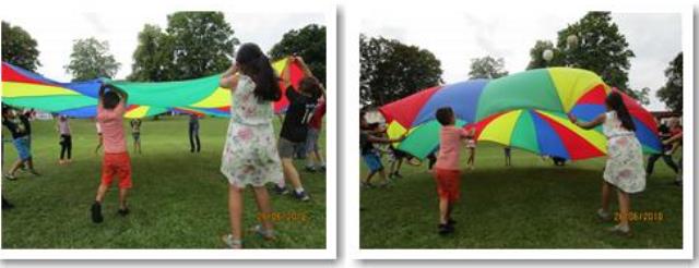 Am Dienstag, den 26.06. bei der Spielnachmittag AG wurde das neue Schwungtuch ausprobiert. Und die Kinder hatten sehr viel Spaß damit zu spielen. So konnten sich Kinder darunterlegen, mal obendrauf. Dann sollte mal ein Ball auf dem Tuch bewegt werden, ohne dass er herunterfällt, danach mit zwei Bällen. Auch drunter weg laufen. Platzwechsel. Es war gemeinsame Aktion mit allen Kindern und hat auch nur funktioniert, weil alle Kinder mitgemacht haben. Es wird auf jeden Fall wieder einen Nachmittag mit dem Schwungtuch geben.