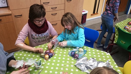Bei der letzten Mittwochsaktion vor Ostern durften die Kinder passend zur Jahreszeit Ostereier färben.