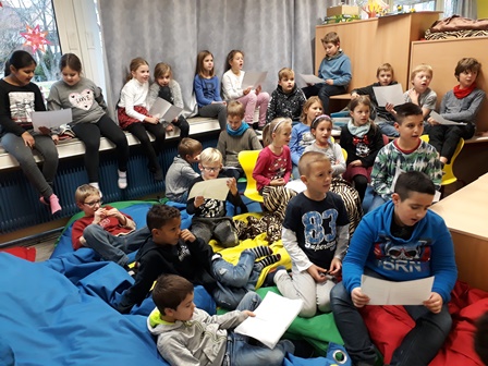 Der Nikolaus besuchte auch die Kinder im Ganztag. Zur Begrüßung sangen die Schülerinnen und Schüler gemeinsam mit Leiterin Jessica Wolff und Erzieherin Lisa-Marie Bauer „Lasst uns froh und munter sein“, ehe der Nikolaus zu jedem Kind eine individuelle Rückmeldung gab und kleine Geschenke verteilte.