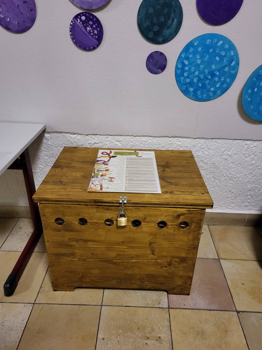 Die Kompostwürmer werden zukünftig die Reste vom Schulobst in wertvollen, nährstoffreichen Humus sowie Wurmsaft (Dünger) für unseren Schulgarten umwandeln.