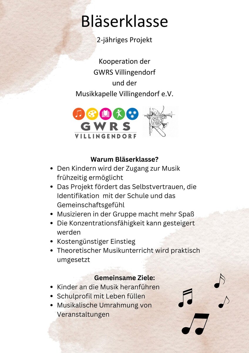 Die GRS Villingendorf und die Musikkapelle Villingendorf e.V. starten immer im September mit Beginn eines neuen Schuljahres eine neue Bläserklasse in Klassenstufe 3.