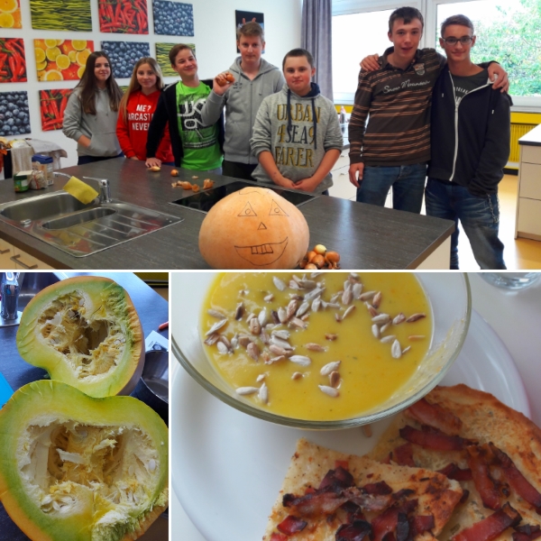 Dank unseres Schulgartens, den Frau Schlieter nicht nur im Rahmen ihrer Sozialwerkstatt mit viel Herz und Engagement hegt und pflegt, konnte frisch geerntetes Gemüse im Hauswirtschaftsunterricht zubereitet werden. Neben einer leckeren Kürbissuppe, wurde auch knuspriger Flammkuchen mit Zwiebeln hergestellt. Die HTW-Gruppen möchten sich auf diesem Wege ganz herzlich für die Obst- und Gemüselieferungen in Bio-Qualität während des ganzen Schuljahres sowie die große Mühe, die hinter der Pflege des Schulgartens steckt, bedanken. Wir freuen uns schon auf die nächsten Vitaminbomben!