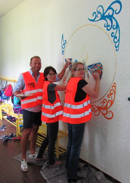 Unter anderem kamen so auch Christine Mathieu, Tanja Stadler und Boris Braun an die Grund- und Werkrealschule Villingendorf. Sie hatten es sich zum Ziel gemacht den Flur im Untergeschoss des Grundschulgebäudes fröhlicher zu gestalten. Die Kinder der ersten und zweiten Klassen zeigten sich begeistert über das Projekt, denn von nun an verschönert ein farbenfroher Schmetterling ihren Garderobenbereich.