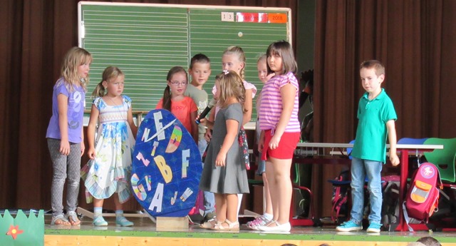Die Feierlichkeiten fanden ihre Fortsetzung in der Festhalle, wo die Schülerinnen und Schüler der zweiten Klassenstufe ihre Nachfolger mit einem Lied herzlich willkommen hießen. Der Buchstabenfresser sorgte im gleichnamigen Theaterstück unter Leitung von Tanja Besemer und Raphael Meißner für kurzweilige Verwirrung. Grundschulkoordinatorin Birgit Storz und Rektor Rainer Kropp-Kurta richteten schließlich gute Wünsche an die 36 neuen Erstklässler, die hernach ihre allererste Unterrichtsstunde mit ihren Klassenlehrerinnen Julia Haag und Lena Hespeler erlebten. Die Familien wurde die Wartezeit vom Catering durch die neue Irland-Klasse versüßt.