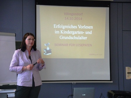 Nach der Begrüßung und Vorstellungsrunde erklärte Frau Sonja Liebsch von der Stiftung Lesen warum Lesen und Vorlesen so wichtig sind. Sie zeigte, wie eine gute Vorleseatmosphäre geschaffen wird und umriss kurz die sechs Phasen des Spracherwerbs, die entscheidend sind bei der Fragestellung, welche Bücher sich für welches Alter und welches Geschlecht eignen.
