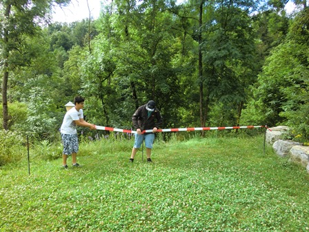 Die Teilnehmer bereiten an der Ruine Herrenzimmern eine Schussbahn vor. Dabei stehen zunächst Sicherheitsaspekte im Vordergrund. Nach einer weiträumigen Absperrung folgen Belehrung und einweisende Erklärungen zur Handhabung der Langbögen.