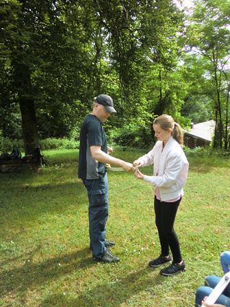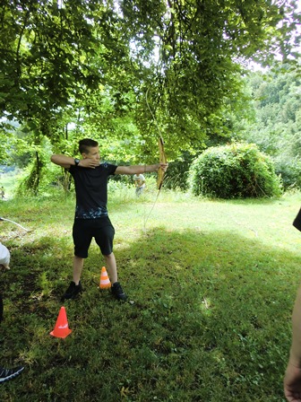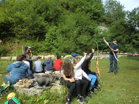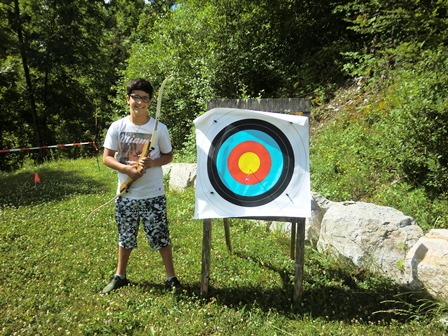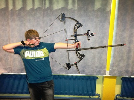 Ein zweiter Experte bereichert unsere Projektgruppe: Sebastian demonstriert die Handhabung seines professionellen Sportbogens.