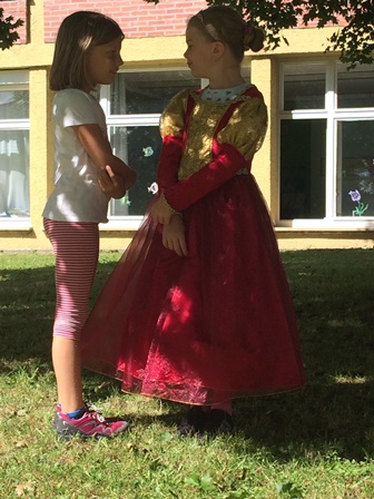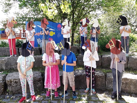 Am Ende des dritten Projekttages hatte jedes Kind sein Steckenpferdchen fertiggestellt, so dass sie nun beritten werden konnten. Zu einer mittelalterlichen Musik wurde ein Dressurritt einstudiert, der auf dem Schulfest den Zuschauern vorgeführt wurde.
