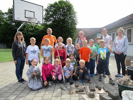 Ein besonderes Highlight war der Besuch von Bernd Digeser von der Firma „Das Naturbaustoffhaus“ aus Bösingen am Dienstagmorgen. Hier wurde gemeinsam eine Lehmmasse angerührt und anschließend wurden wie schon früher im Mittelalter mithilfe einer Holzpresse Steine gepresst. Jeder durfte mithelfen und es wurde auch ordentlich gematscht.