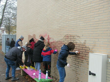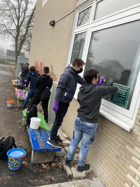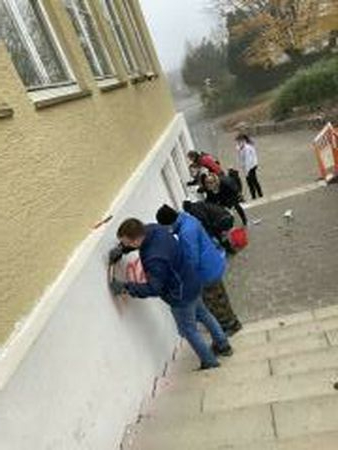 Der Elternbeiratsvorsitzende Jan C. Rolli hatte zu einer Reinigungsaktion der zahlreichen Schmierereien, die vermutlich von Impfgegnern im Vorfeld einer Impfaktion in den Räumlichkeiten der Schule gemacht wurden, aufgerufen. Auch Bürgermeister Marcus Türk oder die ehemalige Schülerin und Landespreisträgerin Laura Pietruszka ließen sich nicht nehmen, mit Hand an zu legen.