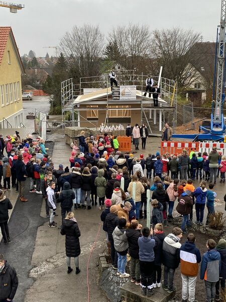 Kurz vor Weihnachten wurde Richtfest gehalten: Das neue Spielehaus nimmt deutlich Formen an und wird im neuen Jahr den Kindern des Ganztags zur Verfügung stehen. Schulleiter Rainer Kropp-Kurta bedankte sich bei Anja Maier, Claudia Seifried und Kämmerer Michael Hardtmann, die im Sommer in Windeseile erfolgreich einen Förderantrag gestellt hatten, der Gemeindeverwaltung und dem Gemeinderat für den flotten Beschluss sowie José Garcia für die koordinierenden Planungen.