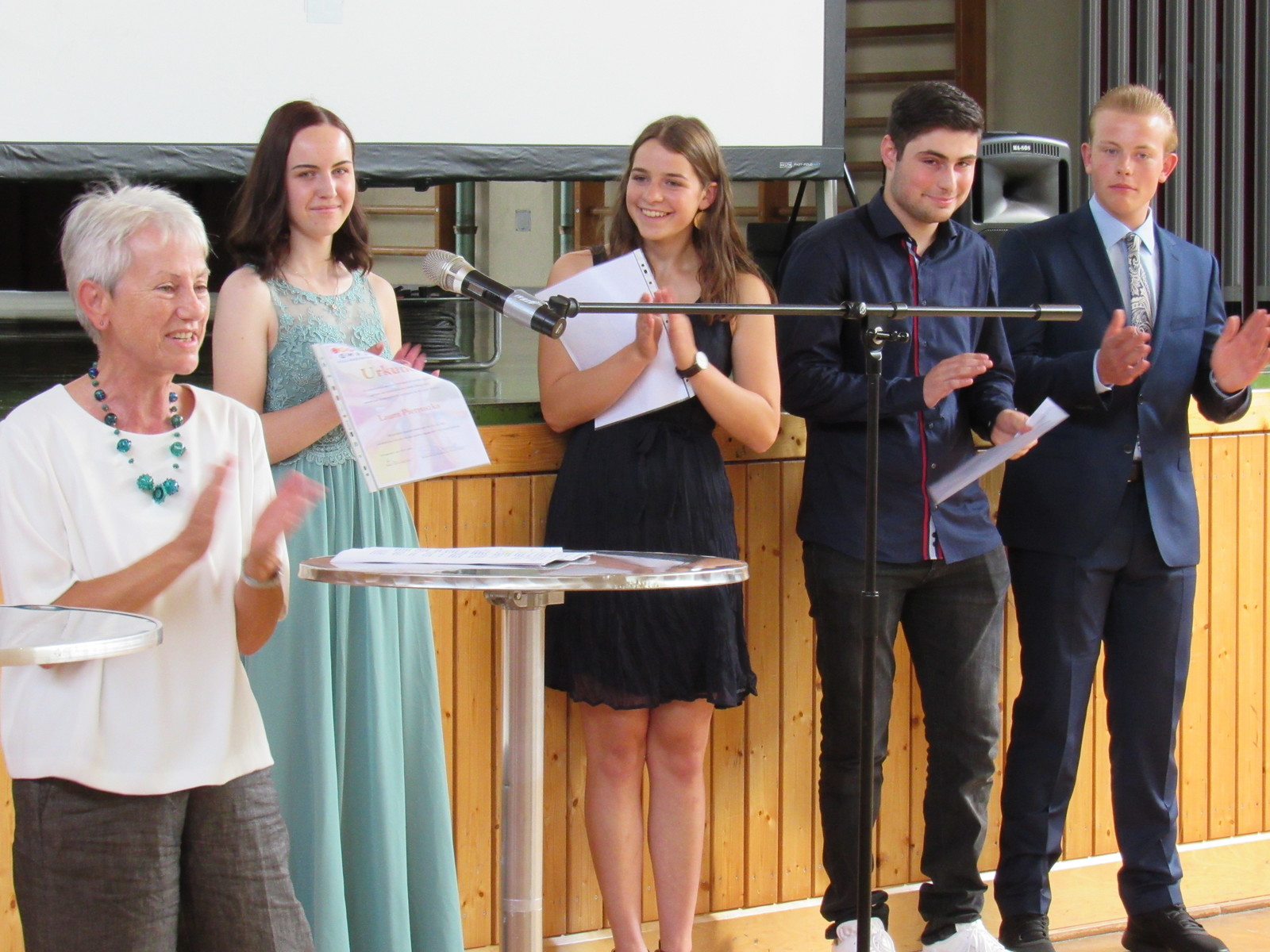 Mit Robin Hengstler zum Quartett ergänzt, bat die Leitende Schulamtsdirektorin Sabine Rösner vom Staatlichen Schulamt Donaueschingen die Vier zu sich. In einer kleinen Laudatio würdigte Rösner die Leistungen dieser Zehntklässler, die mit ihrem besonderen Engagement in den Wahlpflichtfächern Gesundheit und Soziales sowie Wirtschaft und Informatik, aber auch weit darüber hinaus, zu den Landesbesten des Jahrgangs gehörten. Sie überreichte jeweils einen vom Kultusministerium Baden-Württemberg und der Akademie für innovative Bildung und Management Heilbronn-Franken bzw. der Stiftung Würth ausgelobten Landespreis Werkrealschule, der normalerweise im Rahmen einer Feierstunde im Neuen Schloss in Stuttgart durch die Kultusministerin Dr. Susanne Eisenmann ausgehändigt worden wäre.