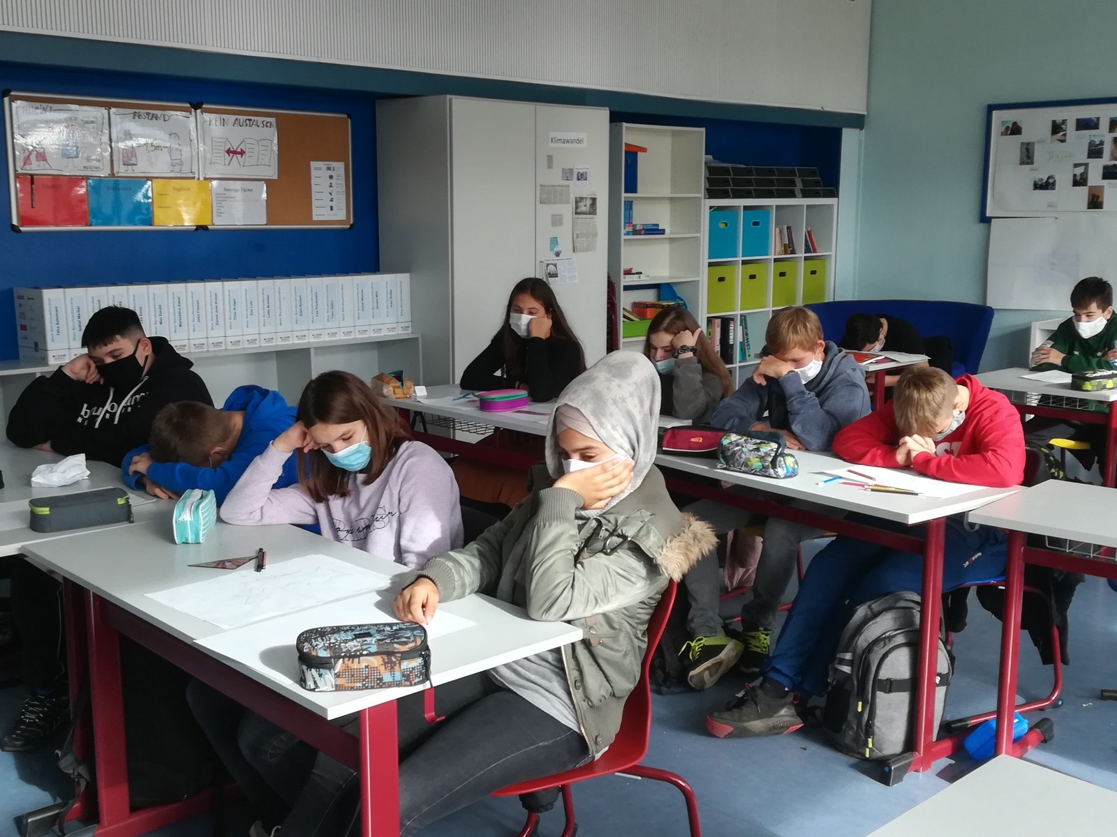 Die Schülerinnen und Schüler zeigten damit ihre Solidarität mit dem französischen Pädagogen, der am 16. Oktober 2020 in einem Pariser Vorort Opfer eines brutalen islamistischen Anschlags wurde.