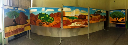 Im Projekt "Tuishi Pamoja - Kulissenmalerei" haben die Schülerinnen und Schüler eine afrikanische Savannenlandschaft auf großen Leinwänden malerisch umgesetzt.