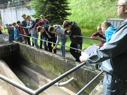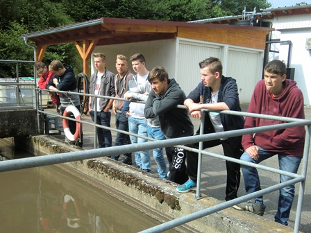 Wie verhält es sich aber dann mit dem Leitungswasser? Wo kommt unser Trinkwasser her? Um diese Fragen zu beantworten, ging es am folgenden Tag zum Wasserwerk Neckarburg. Dort erklärte uns Herr Merz, wie die Wasserversorgung der Gemeinden rund um Dietingen sichergestellt wird. Dafür nutzt man im Neckartal vier eingefasste Quellen, die sich aus dem Regenwasser vom Hochwald über Villingendorf bis zum Neckartal speisen. Die Aufbereitung des Quellwassers erfolgt zunächst über Ultrafiltration, einem physikalischen Membrantrennverfahren nach dem Niederdruckprinzip. Hier werden kleinste Verunreinigungen entfernt sowie Viren und Bakterien eliminiert. Danach durchläuft das Wasser die aus zwei Druckkesseln bestehende Aktivkohlefilteranlage. Diese dient der Entnahme von organischen Spurenstoffen und Pestiziden. Erst im Anschluss erreicht das so aufbereitete Quellwasser den Reinwasserbehälter. Geringe Mengen zugesetzten Chlors schützen das Wasser jetzt vor bakteriologischen Veränderungen. Die Verbraucher erreicht schließlich eine Mischung aus Bodensee- und Quellwasser, damit der Kalkgehalt unterhalb der vorgeschriebenen Grenzen bleibt.