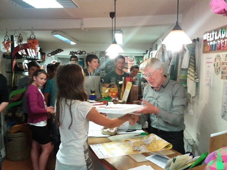 Während eine Gruppe auf dem Markt ihren Apfelsaft aus heimischen Streuobstwiesen und Mango-Apfelsaft sowie afrikanische Schokoladen –Häppchen gegen freiwilliger Spende den Marktbesuchern anbot, bekam die andere Gruppe einen Vortrag im Weltladen über afrikanische Kakao-Plantagen. Auch über die Arbeit im Weltladen und über die verschiedenen Produkte wurden die Schüler informiert. Damit alle am Ende die gleichen Erfahrungen machen konnten, tauschten die Gruppen später ihren Standort.