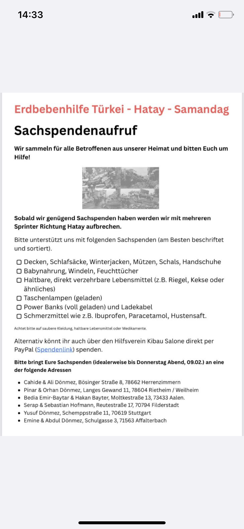 Das Leid, welches das Erdbeben in der Türkei und in Syrien verursacht, macht uns alle betroffen. Birsen Su, Mitglied unseres Schulteams, fährt diesen Freitag in ihre alte Heimat Samandag in der Türkei. Sie bringt mit anderen Familien Sachspenden direkt vor Ort zu den Betroffenen. Was benötigt wird, kann dem Anhang entnommen werden.
