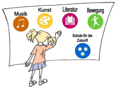 Das Schullogo zeigt auf einen Blick die Säulen unseres Schulprofils. So finden regelmäßig Kunst-, Musik- und Literaturprojekte statt. "Bewegte Pausen", Spielgeräte und Sportangebote sorgen für den körperlichen Ausgleich unserer Schüler. Wir setzen in unserem Schulleben über das Jahr verteilt viele bunte Akzente, um die Kreativität unserer Kinder zu fördern und die Ziele des Bildungsplans umzusetzen.