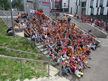 Gemeinsam mit 20 Lehrerinnen und Lehrern besuchten sie das Eröffnungsspiel der Fußball-U19-Europameisterschaft zwischen Deutschland und Italien. Das Stadion war nahezu ausverkauft und so wurde dieses Spiel mit knapp 55.000 Kindern, Jugendlichen und Erwachsenen aus ganz Deutschland zu einem für viele Schüler einmaligen Erlebnis in schwarz-rot-goldenen Farben.
