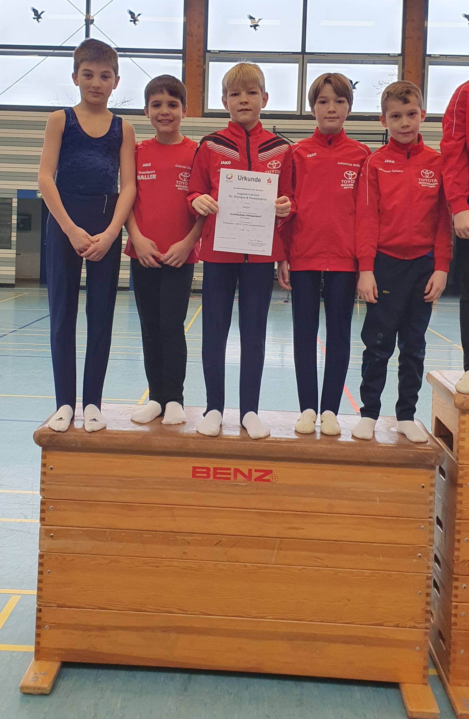 Auch die Jungs waren am 17.01.24 in Spaichingen beim Kreisentscheid erfolgreich am Start. Sie turnten schöne Übungen am Boden, Sprung, Barren und Reck. Am Ende erreichten sie den 2. Platz. Vielen Dank auch an Lysiane Wagner, die momentan ihr FSJ Sport bei uns absolviert, für ihren Einsatz als Kampfrichterin.