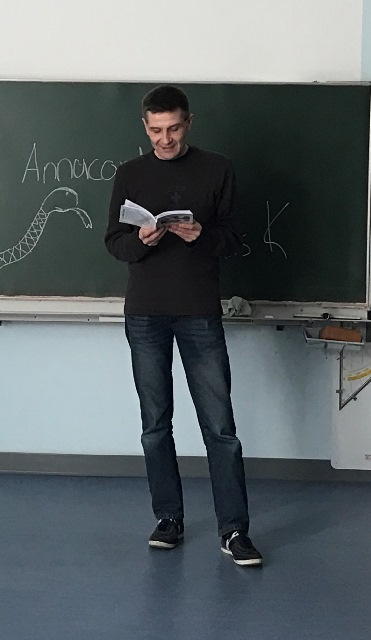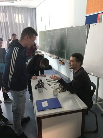 Eigentlich erzählte er nur aus seinem Leben und schaffte es dennoch, immer wieder Passagen aus seinem Buch einzubinden und die Zehner zum Lachen zu bringen. Als er dann seinen Song „Maincoon“ spielte, erkannte man das Multitalent Al Page. Mit einem Cliffhanger weckte er zum Abschluss das Interesse, das Buch zu Ende zu lesen und stellte sich bei der anschließenden Autogrammstunde den neugierigen Fragen der Schüler.