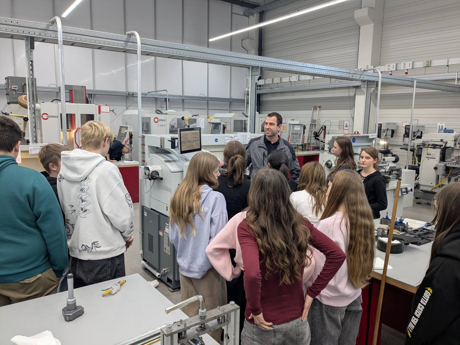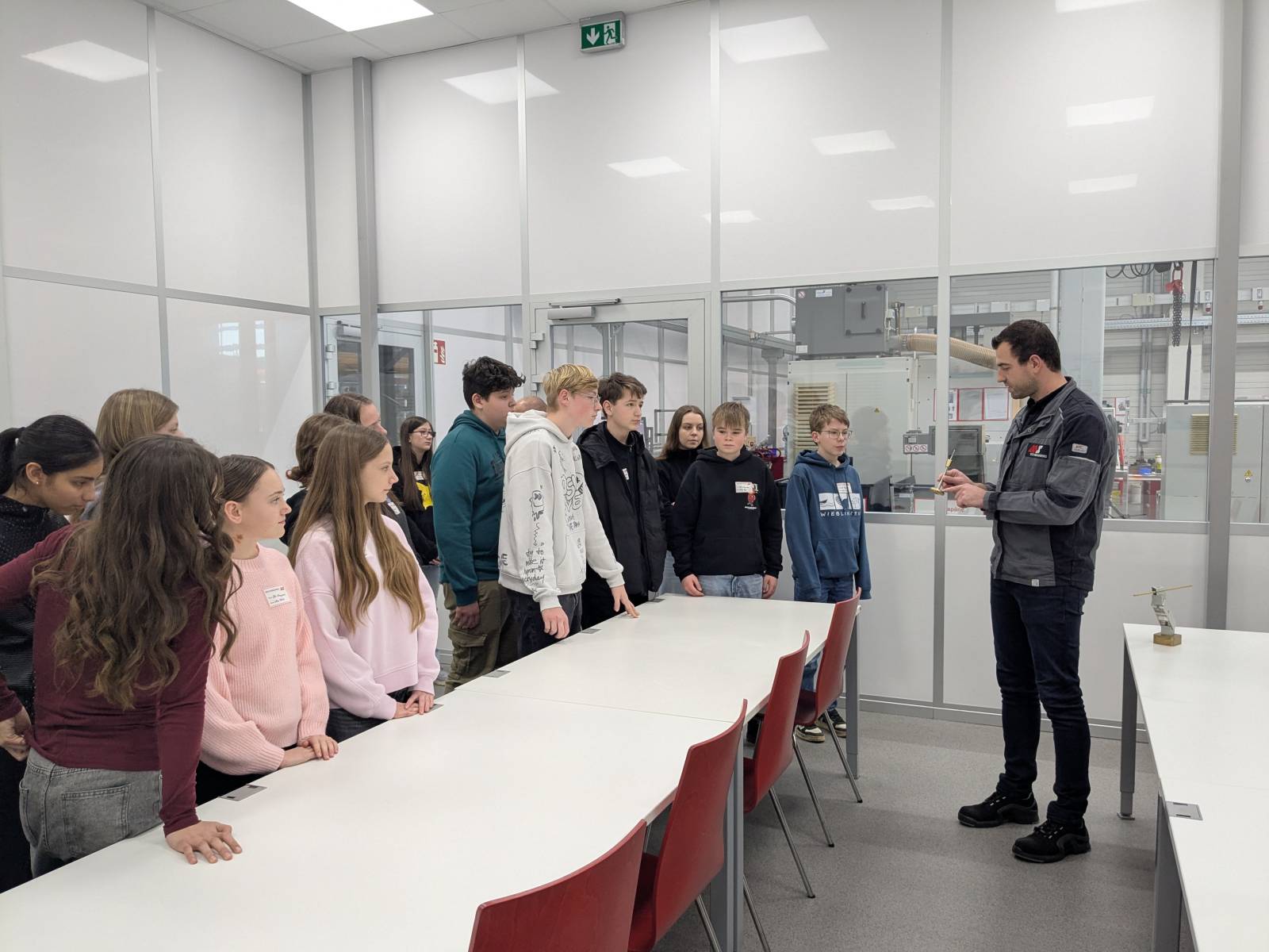 Ein besonderes Highlight des Nachmittags war die anschließende Führung durch die verschiedenen Abteilungen sowie die Lehrwerkstatt, die von Herrn Schneider durchgeführt wurde. Hier konnten die Schülerinnen und Schüler hautnah erleben, wie moderne Arbeitsprozesse aussehen und welche Technik dabei zum Einsatz kommt. Auch praktisches Ausprobieren kam nicht zu kurz: Beim Geschicklichkeitsspiel „Heißer Draht“ war Konzentration und eine ruhige Hand gefragt.