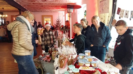 In stimmungsvoller Atmosphäre setzte die Apfelklasse auf dem Weihnachtsmarkt auf dem Hofgut Hohenstein ihren Verkauf von selbstgemachten Produkten fort. Dank des engagierten Einsatzes der Schülerinnen und Schüler sowie der kauffreudigen Kundschaft wurde nahezu alles verkauft.