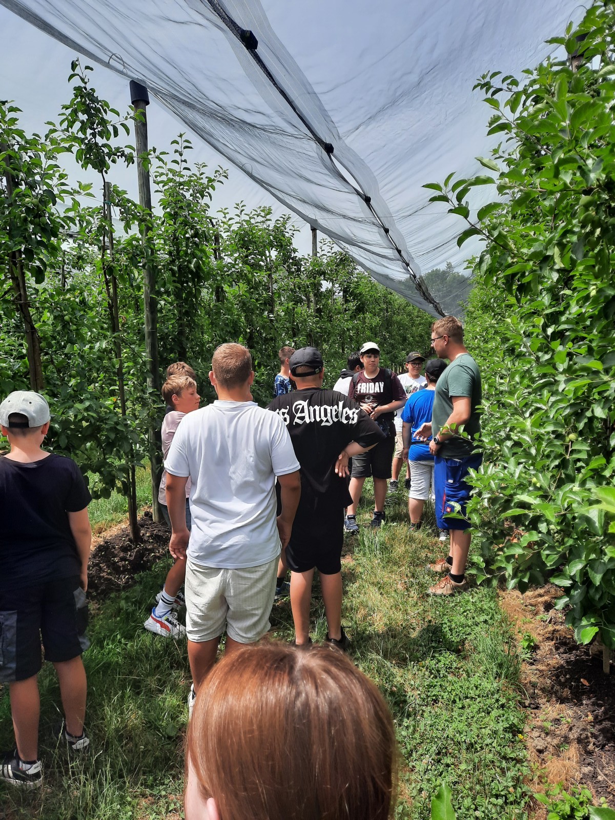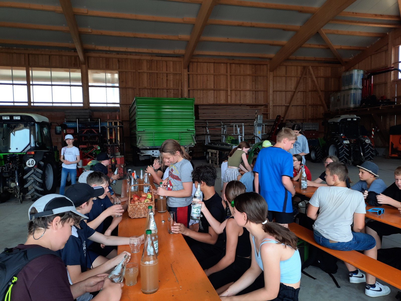 Nachdem die Schüler:innen sich mit kühlem Sprudel, frischem Apfelsaft und leckeren Äpfeln erfrischen durften, wurde ihnen bei einer Führung die Apfelplantage gezeigt. Die Schüler:innen lernten interessante Dinge über den Obstanbau, die Lagerung und Verarbeitung von Äpfeln sowie die hauseigene Brennerei kennen. Sogar die Traktoren durften genauestens angeschaut werden. Zu guter Letzt gab es sogar noch eine gegrillte Wurst im Wecken.
