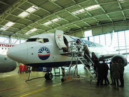 Im Anschluss folgte die direkte Anschauung in Form einer Flughafenführung. Sicherheitskontrolle, Abfertigungsbereiche, Rollfeld, Winterdienst und Gepäcklogistik. Im Gebäude der Flughafenfeuerwehr gab es Einsatztrucks zu bestaunen, deren Raddurchmesser so manche Schülerlänge überragte. Tonnenschwere Kolosse, die mithilfe von Panzermotoren jeden Winkel des Flughafengeländes innerhalb von nur zwei Minuten erreichen können. Die Löschleistung dieser Fahrzeuge lässt sich mit nichts vergleichen, was die Schüler aus den Feuerwehrmagazinen ihrer Heimatorte gewohnt sind – alles eben eine Nummer größer hier. In einer riesigen Wartungshalle der Lufthansa durften wir uns dann frei bewegen: Cockpit erkunden, Turbinen umrunden, den Technikern über die Schulter schauen, unter dem Bauch mächtiger Langstreckenflieger stehen und das Kabelgewirr der elektrischen Infrastruktur solcher Maschinen bestaunen. Faszination und Spannung pur. Dafür wurde dann gerne in Kauf genommen, dass wir erst einen Zug später heimwärts gen Rottweil nehmen konnten.