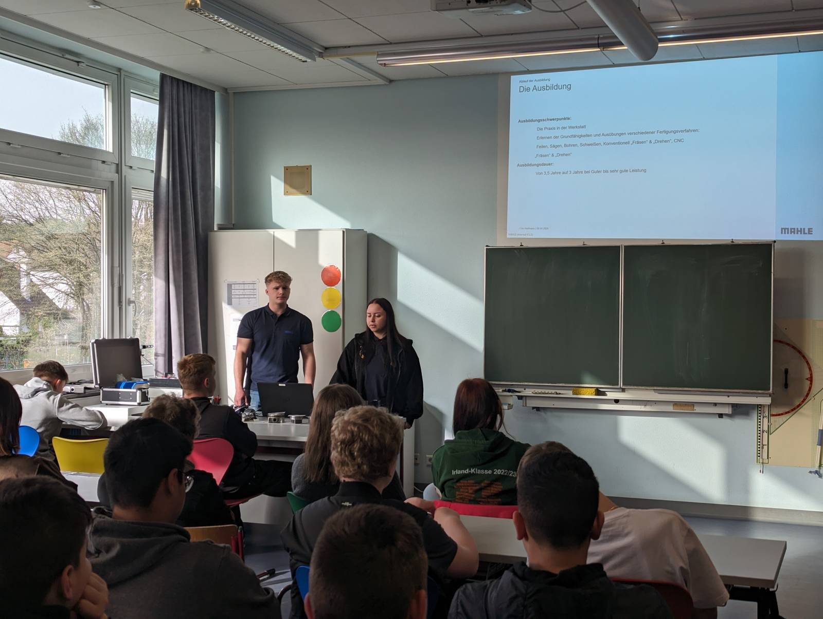 Zwei Auszubildende der Firma Mahle besuchten die Achtklässler und erzählten ihnen einige interessante und spannende Informationen zum Ausbildungsberuf des Industriemechanikers. Wir bedanken uns für den Besuch der Ausbildungsbotschafter und den informativen Vortrag.