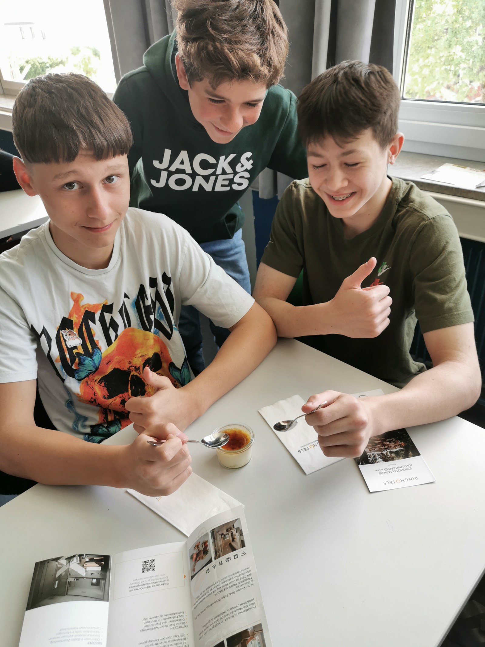 In der Küche wird eigentlich alles selbst und frisch zubereitet und Herr Maier brachte uns ein kleines „Probiererle“ mit: Crème brûlée – das hatten viele unserer Achtklässler/innen noch nie zuvor gegessen! Wir danken herzlich für den Besuch und den Einblick!