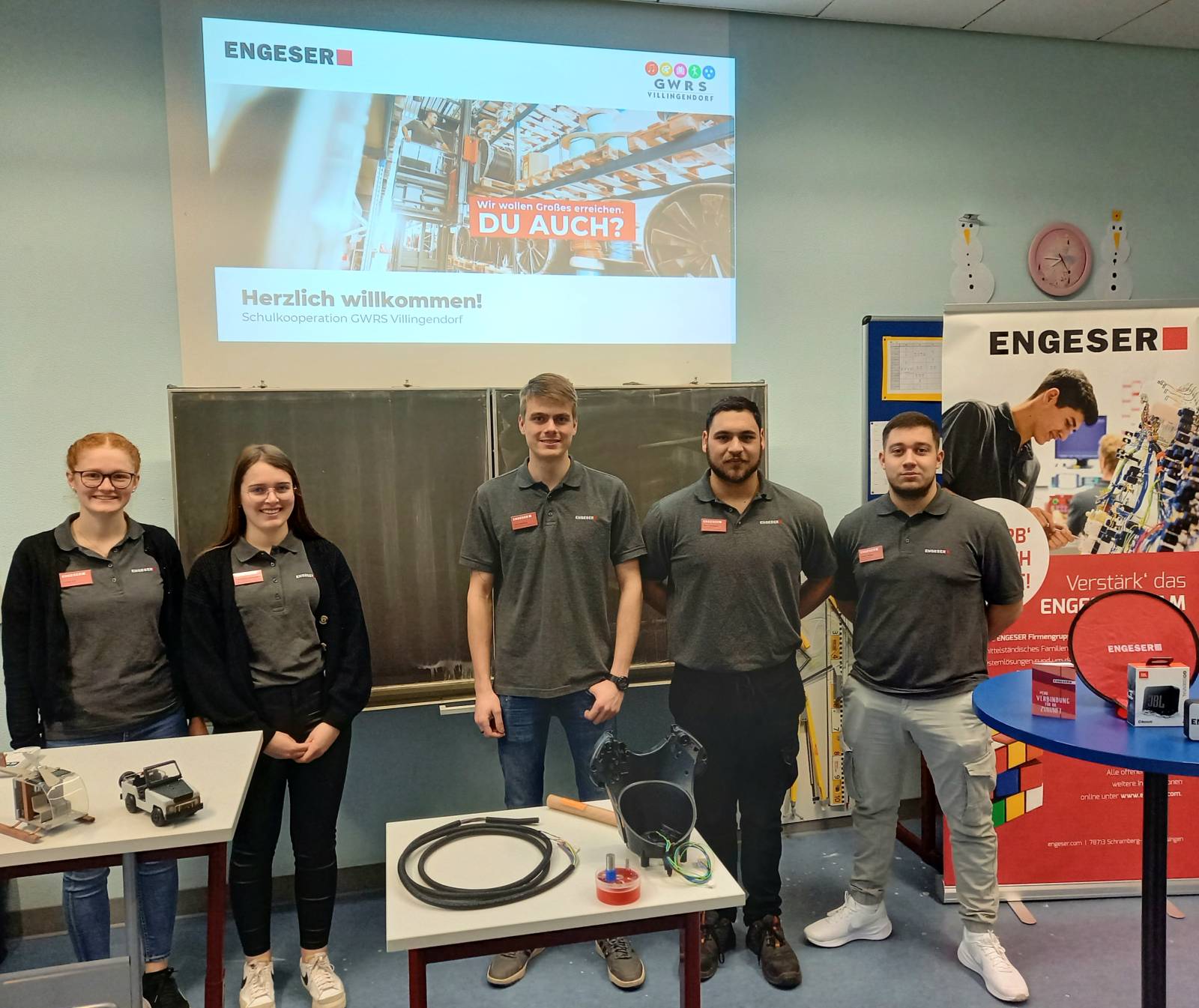 Mit Larissa Hirt, Madeleine Moosmann, Edwin Diring, Artur Hakobyan und Janic Behling besuchten jüngst gleich fünf junge Ausbildungsbotschafter von der Engeser GmbH aus Waldmössingen die Schülerinnen und Schüler der Klassenstufe 9. Kurzweilig stellten sie die Ausbildungsberufe Maschinen- und Anlagenführer, Mechatroniker, Industriekaufmann sowie Fachkraft für Lagerlogistik (alle m/w/d) vor. Zudem warben die Azubis für ihre Praxisworkshops, die während eines Vormittags in den Gebäuden der Engeser GmbH in Waldmössingen geplant sind. Für jedes der genannten Berufsbilder soll es dann ein eigenes Programm geben. „Wenn dich eines dieser Berufsbilder interessiert, freuen wir uns auf dich“, motivierte Hirt die Jugendlichen zur Teilnahme am zweiten Teil des Projekts. Über ein onlinebasiertes Quiz zeigten die Schülerinnen und Schüler zum Abschluss, dass sie zuvor aufmerksam mitgearbeitet hatten. Das spannende „Ringen“ um die vorderen Plätze im Echtzeitranking sorgte für großen Spaß. Bis zum Ende der Woche ordnen sich die Schülerinnen und Schüler auf Wunsch einem der vier Praxisworkshops zu. Der Transfer von Villingendorf nach Waldmössingen ist durch die beiden Kooperationspartner geregelt.