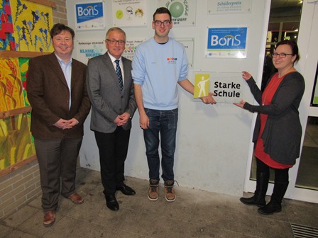 Schulleiter Rainer Kropp-Kurta, Bürgermeister Karl-Heinz Bucher, Schülersprecher Robert Erk und Elternbeiratsvorsitzende Christine Brenner mit der neuesten Ehrung der GWRS
